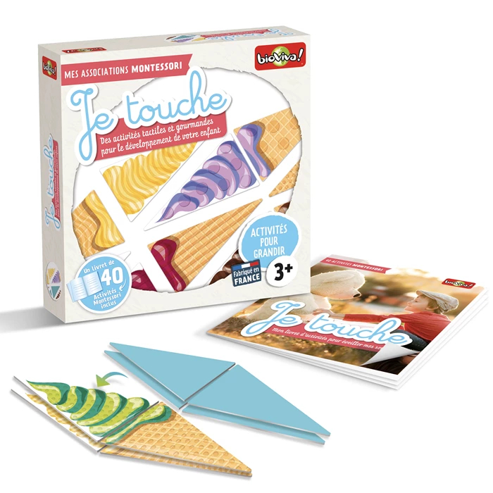 Avec « Je touche », votre enfant va pouvoir stimuler et affiner ses perceptions tactiles. Le but est de stimuler et affiner le toucher en reconstituant les glaces italiennes ayant la même texture. Livret de 40 activités Montessori inclus.