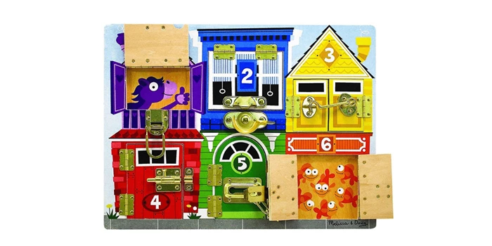 Libère une serrure, ouvre la porte numérotée en la faisant basculer et prépare-toi à t’amuser lorsque l’image en dessous est révélée sur cette planche de jeu en bois ! Développe des aptitudes motrices de précision tout en favorisant la connaissance des couleurs, des nombres, des animaux et davantage !